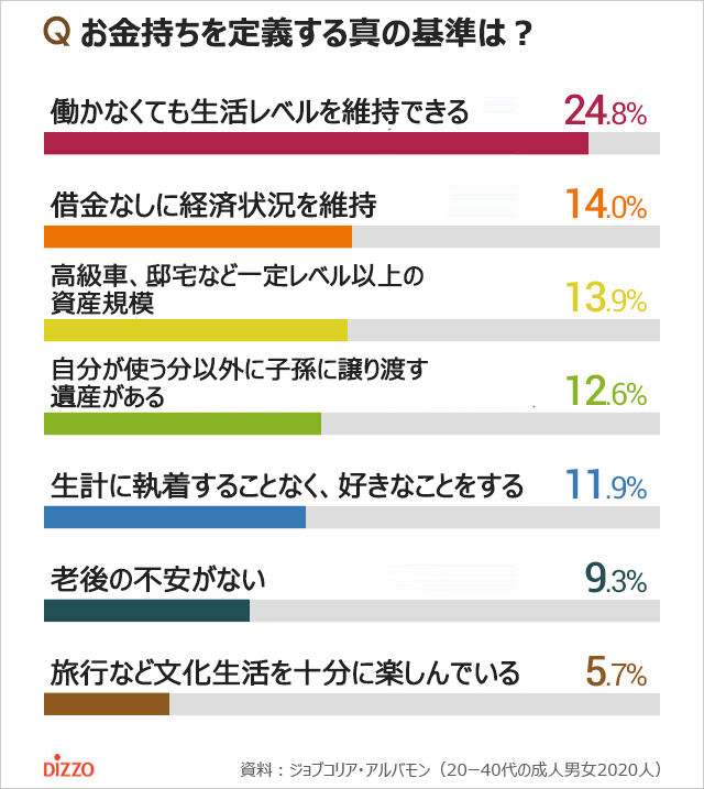また、自分が考える真のお金持ちの基準は何かについて質問した結果、「働かなくても今のような、もしくは今以上の生活レベルを維持、営むことができる」が24.8%で1位となった。