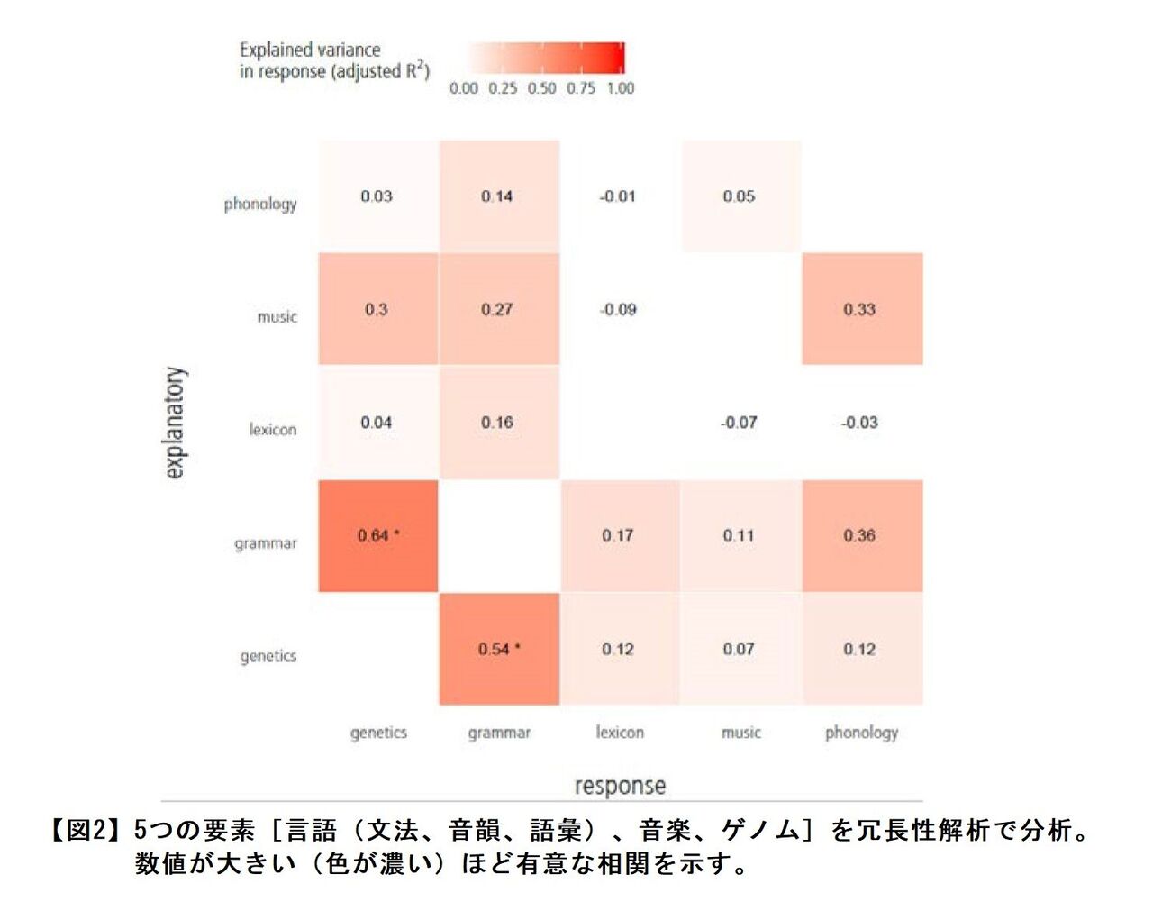 【図2】5つの要素〔言語(文法:grammar、音韻:phonology、語彙:lexicon)、音楽、ゲノム〕の関係を可視化