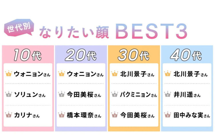 10代20代のトップがウォニャス。その時点で聞いたのは日本人じゃねえよw選択肢にそんなの上がってくるわけねえw30,40も北川景子。これ、韓国人に大人気のやつねw