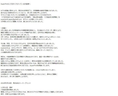 スーパープリントは「生産システムと管理システムとメールを失い、長年のお客さまからの信頼も失ってしまった。韓国支社との対話もできず、解決の見込みがないため、無念ではあるが事業継続を断念し、既入金分のご返金処理を5月中に完了させ、SuperPrintを閉鎖する」と告知している。