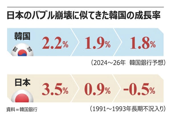 今の韓国経済は日本の「失われた30年」の初期と似ている。韓国など新興国に製造業の主導権を明け渡した日本は、資産市場のバブル崩壊によって、1990年代に低成長局面に突入した。日本の成長率は1991年の3.5%から1992年に0.9%、1993年にマイナス0.5%へと急転直下し、30年間「ゼロ成長」が続いた。
