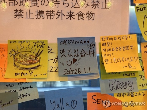 外国人観光客の感想がつづられたメモ用紙=(聯合ニュース)