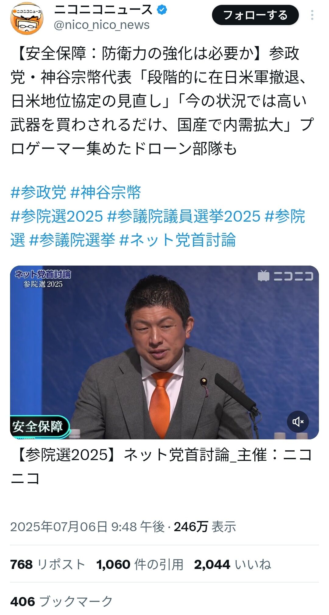 【安全保障:防衛力の強化は必要か】参政党・神谷宗幣代表「段階的に在日米軍撤退、日米地位協定の見直し」「今の状況では高い武器を買わされるだけ、国産で内需拡大」プロゲーマー集めたドローン部隊も