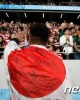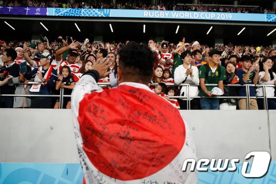 ▲東京スタジアムで行われた2019ラグビーワールドカップで選手が日本国旗を身に巻いたまま観客に挨拶している。©AFP =ニュース1